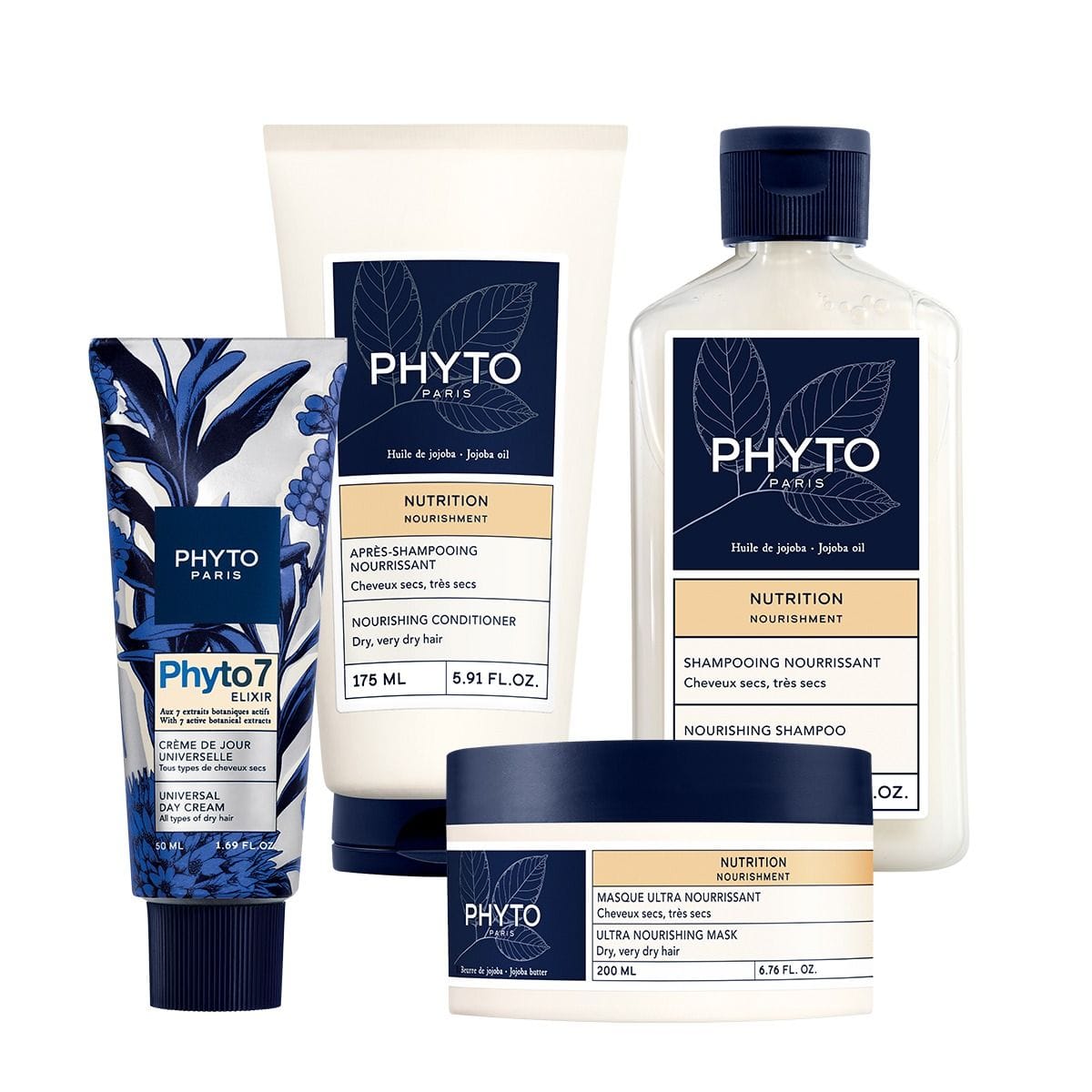 De NOURISHMENT Shampoo reinigt het haar op milde wijze zonder het te verzwaren. Het haar is zachter en en soepeler. De NUTRITION Conditioner die droog en zeer droog haar ontwart en voedt, zonder het te verzwaren. De NOURISHMENT Masker asker voedt intens zonder de vezel te verzwaren. Het haar barst van de verzorging en is subliem soepel en zacht. De iconische Dagcrème van PHYTO 7 voedt de haarvezel dagelijks intensief zonder het te verzwaren, disciplineert het en maakt stylen gemakkelijker.